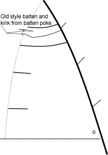 Fig. 17 – Full battened mains hold their own shape better than traditional mains, they are easier to trim, and they eliminate batten poke. Not only that, but they overcome the age old problem of batten poke, which gave mains a kink at the inboard end of the upper battens. And not only that, they last longer too! One or Two?Not all your battens need be full length. Depending on the size and roach of your main only the top one or two battens need be full length. While you’re at it, make sure they are tapered. It is worth the additional cost to get tapered battens. Not Quite Full Length OptionAn alternative to full length battens is longer but not quite full length battens. These avoid the compression and loading along the luff which full length battens create. These are an alternative to consider, particularly on boats which luff slugs or slides, although they do not provide all the benefits of true full length battens. Keep It LooseSome sailors complain of difficulty flattening their fully battened mains. This is most often due to putting the batten in too tight. The full length batten should be inserted with no compression. Better the batten be too loose than too tight. Another cause of trimming difficulty is soft battens. Get stiff, tapered battens. ConclusionIf rule makers are preventing the use of fully battened mains in your area or fleet, join the lobby in favor of full battens. They are better. Catamarans, dinghies, and windsurfers have known it for years.