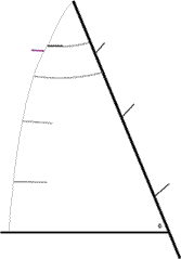 Fig. 7 – With the main at full trim the boom should be on the centerline. Leech TelltalesFrom this initial setting the sheet can be fine tuned to keep the upper leech telltales flowing, with an occasional stall. Usually this telltale behavior achieves the best mix of speed and pointing. There are conditions when performance will improve with the main slightly eased or trimmed compared to the settings described above. You never know until you try. If the sheet is eased slightly, so the telltales never stall, then speed may increase without any loss of pointing ability. At other times, trimming to the point of stalling the telltales half the (or more) time may result in higher pointing, though the added drag will usually cause some sacrifice of speed. Secondary ControlsAs you make adjustments to the secondary controls described below you will need to check and recheck sheet trim.Never relent. You can always go faster. More on the MainsheetIn light air over-trimming the sheet will stall the sail. We seek all the power the sail can generate. This means trimming just short of a stall. Fig. 8, Boat A. In more moderate conditions, higher pointing is possible by trimming the main hard, to the point of a partial stall. There are of course limits on how hard you can trim without a sacrifice of speed. The sheet should be eased to twist out the upper leech of the main when the boat is slow. Fig. 8, Boat B. In heavy air over trimming the mainsheet will create excess weather helm. Some backwinding in the luff of the main is to be expected. Don’t let a little backwinding trouble you – it is fast. . Fig. 8, Boat C.